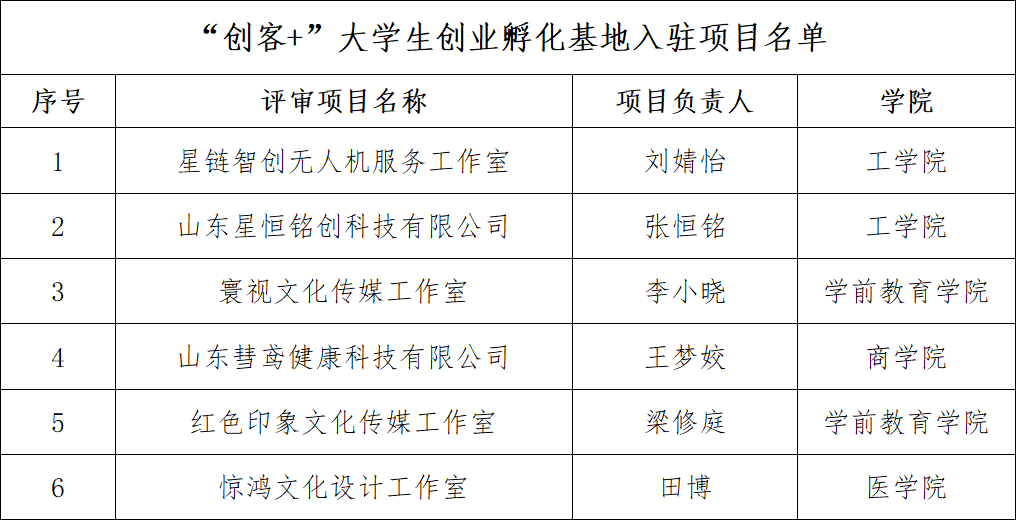 根据《山东英才学院大学生创新创业孵化基地项目管理办法》相关要求,经个人申请、教师推荐、材料审核、专家评审等环节,现将符合入驻“创客+”大学生创业孵化基地的项目名单予以公示: