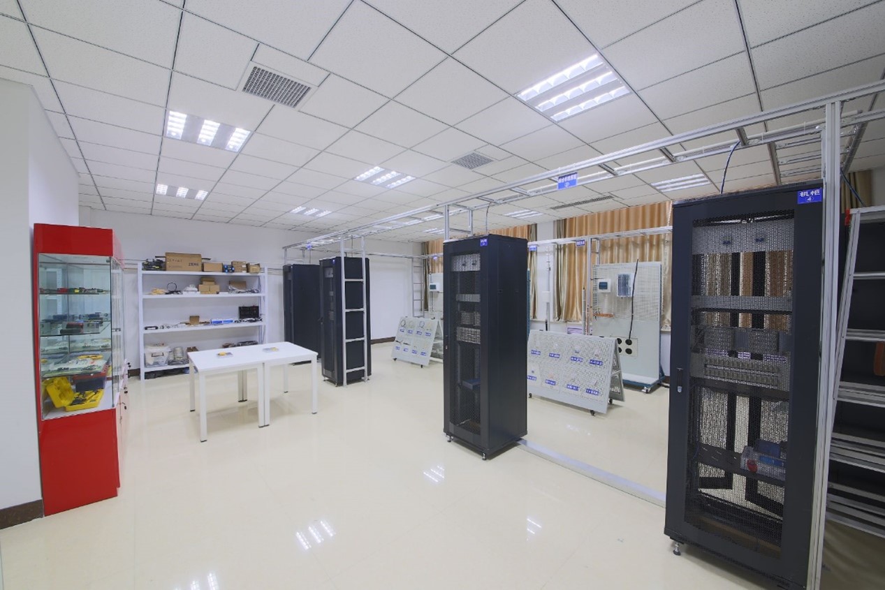 数据通信实验室占地面积约128平米,主要包括“信息安全系统”和“数据通信系统”。其中的 5 个数通机柜,配置相同。均由路由器、三层交换机、⼆层交换机组成。学⽣通过教学区的41台电脑对这些设备进⾏配置,配置完成后,可以在实际设备上进⾏配置和业务的现场验证。