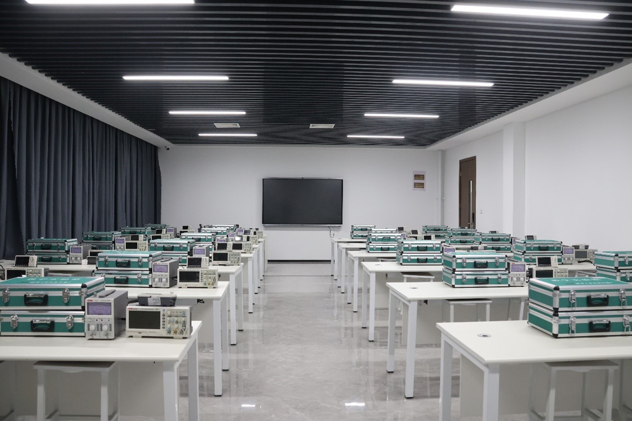 数模电实验室占地面积共计190.8平米,配备有TPE-D3A数字电路实验箱、TPE-A3Ⅱ模拟电路实验箱、示波器、函数信号发生器、双路交流毫伏表各50套以及一部分电子元件和集成电路,学生需自主选择所需元件连接电路来完成实验,操作灵活便捷,可提高学生的综合能力和创新能力。