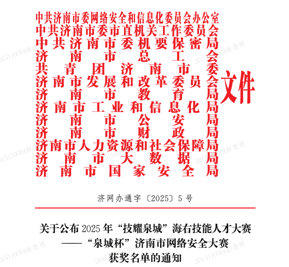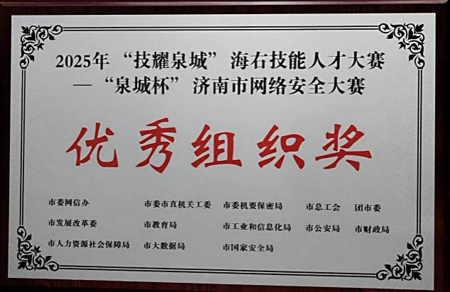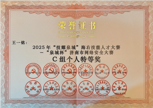 发布者: 时间:2025-09-21 浏览:2025年7月,由济南市委网信办等多部门联合主办的“技耀泉城”海右技能人才大赛——“泉城杯”济南市网络安全大赛落幕,124支队伍、42名选手同台竞技。山东英才学院工学院惊艳全场:斩获C组团体二等奖,学子王一铭勇夺C组个人特等奖,学校获评优秀组织奖,成为赛事中最受瞩目的高校代表之一。
