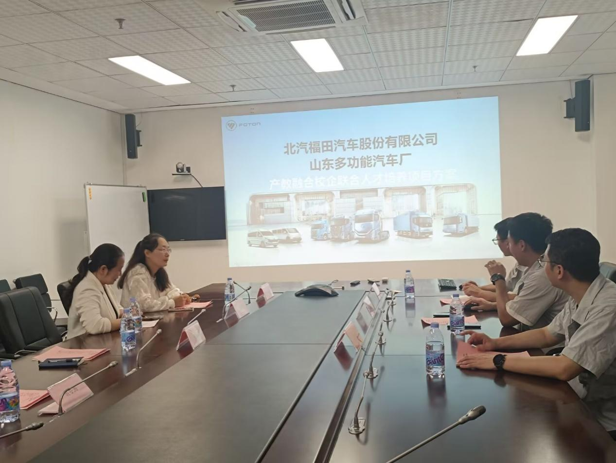 参观结束后,双方进行了深入的校企合作交流洽谈。刘俊庆部长介绍了企业以及几年来开展校企合作的相关情况,同时对25年新入职企业的我校毕业生给与较高评价。蒋丽丽副院长介绍了山东英才学院工学院的专业设置情况及实习计划安排。经过洽谈,双方商定,计划于10月中旬邀请企业到校开展毕业实习宣讲活动。此外,双方也进一步探讨了“福田班”、“现代工程师班”、“福田杯竞赛”等合作模式的可能性。
