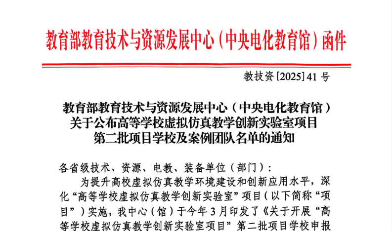近日,教育部教育技术与资源发展中心(中央电化教育馆)印发《高等学校虚拟仿真教学创新实验室项目第二批项目学校及案例团队名单》(教技资〔2025〕41 号),我校 “虚拟仿真教学创新实验室项目” 成功入选。这是我校首次获批该类项目立项,标志着学校在虚拟仿真教学领域的建设与应用获得国家级认可。