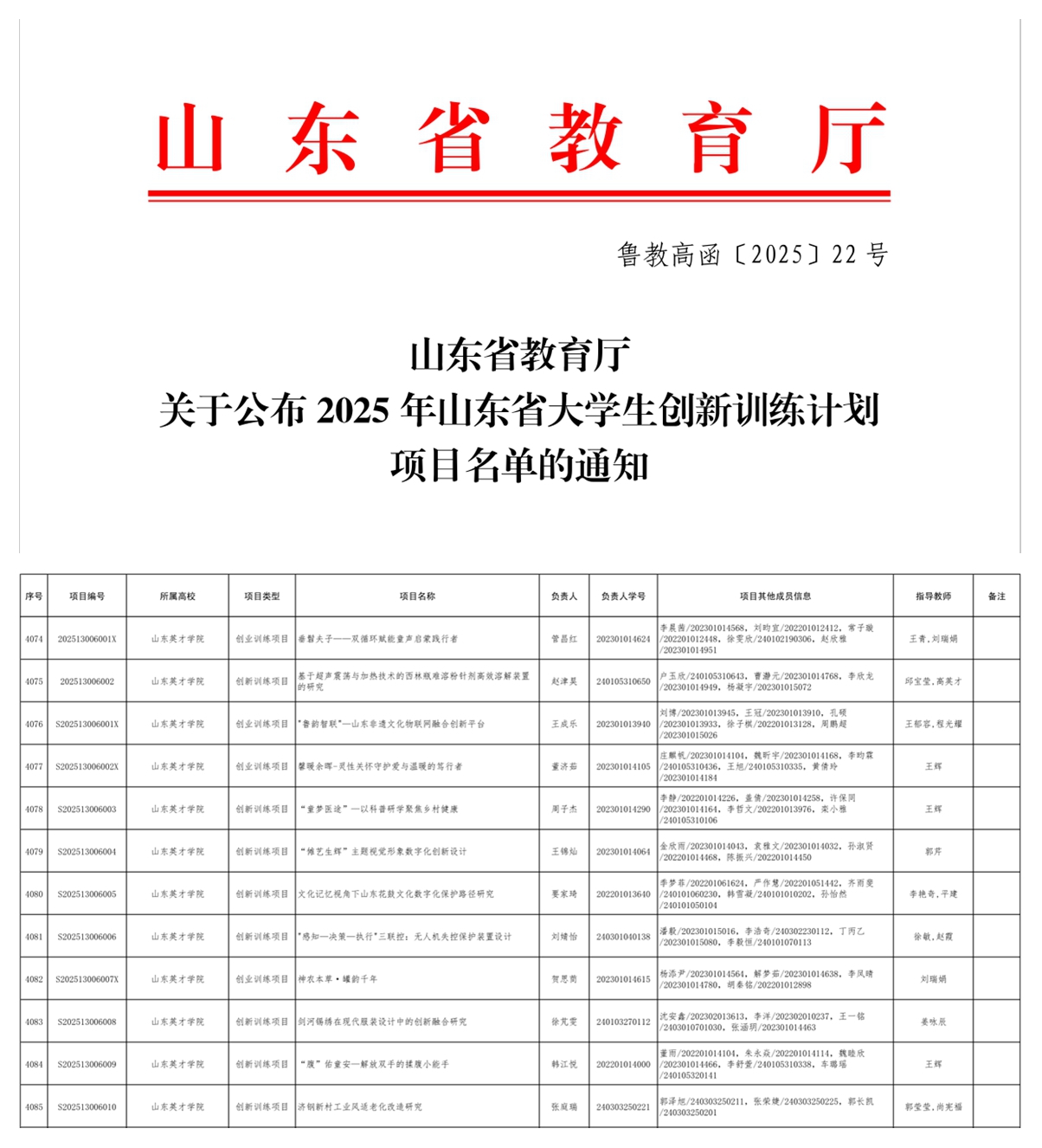 近日,山东省教育厅公布了2025年山东省大学生创新训练计划项目省级以上立项名单,山东英才学院获国家级立项2项,省级立项10项,其中,创新训练项目8项,创业训练项目4项。