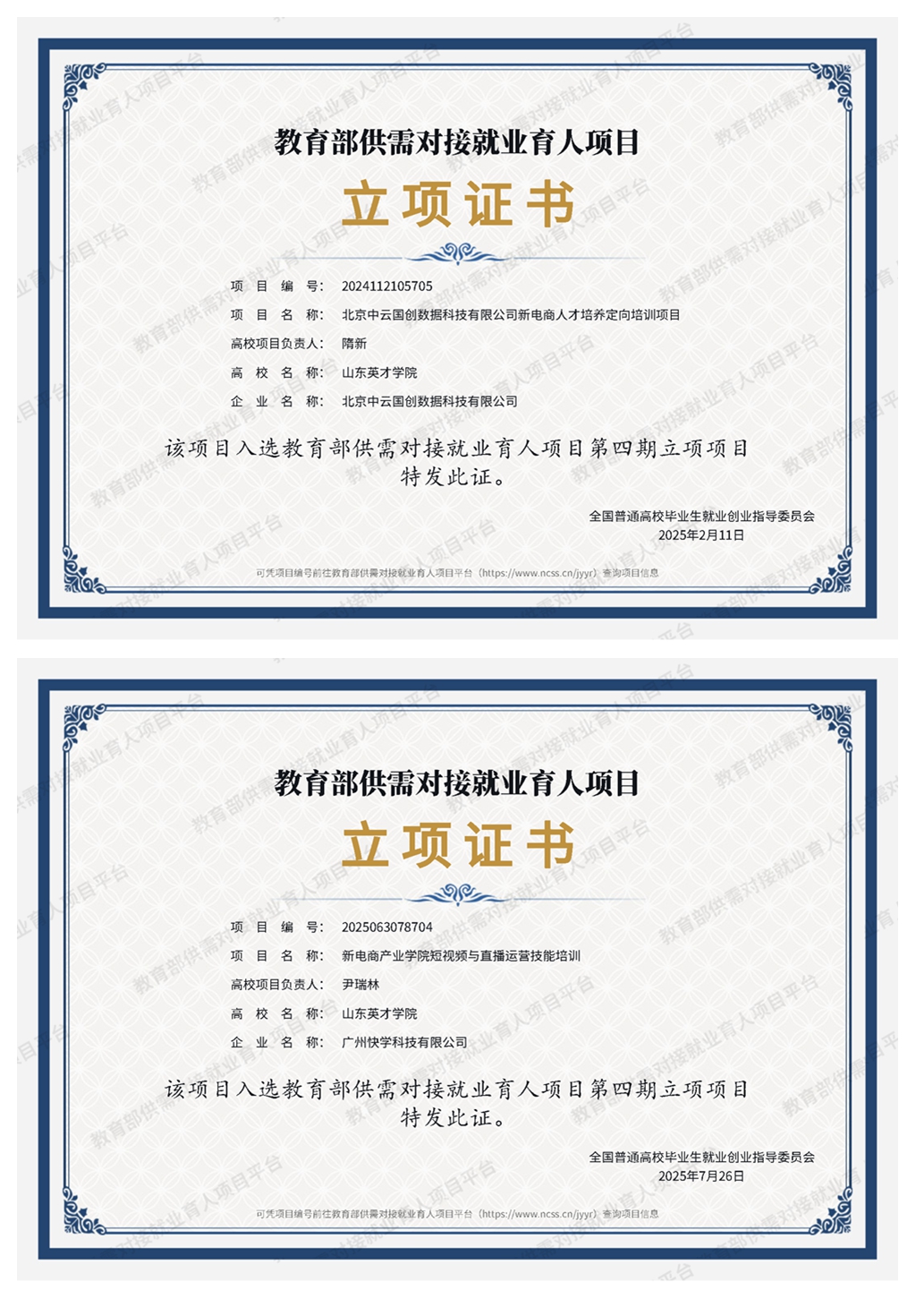 教育部供需对接就业育人项目平台第四期立项名单近日公布,山东英才学院商学院(国际学院)联合两家行业领军企业申报的《新电商人才培养定向培训项目》《新电商产业学院短视频与直播运营技能培训项目》双双获批,实现单年2项教育部该类项目立项的新突破。