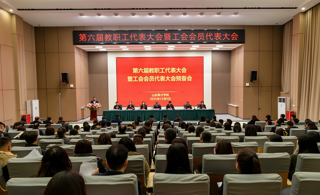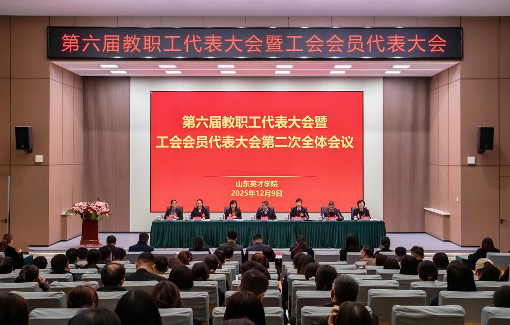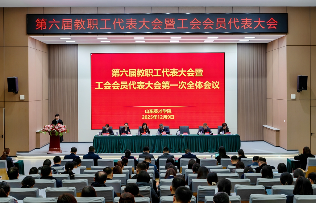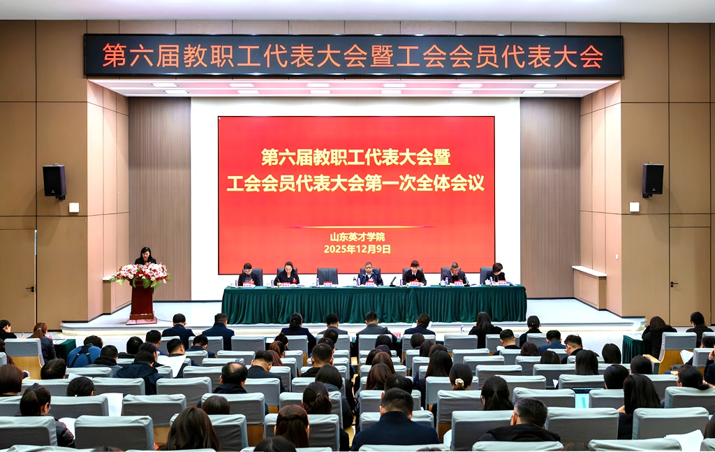 2025年12月9日,山东英才学院第六届教职工代表大会暨工会会员代表大会在南校区学术报告厅隆重举行。山东省教育工会委员会二级调研员王辉,济南市教育工会主席任树军,济南高新区管委会主任助理、高新区总工会主席宋丰华出席开幕式并致辞。学校顾问校长张星臣,党委副书记、执行校长王晓娜,党委副书记、工会主席孙玉香,副校长崔奎勇,纪委书记、副校长李晓玲,副校长孙文红,校长助理张瑞君,正式代表、列席代表等170多人出席会议。