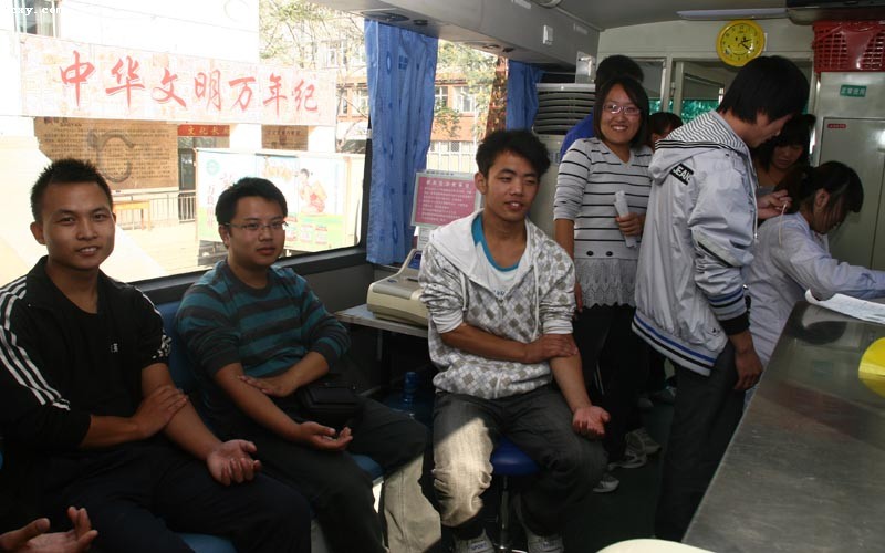 10月15日,在我院大学生活动中心广场前的一辆流动献血车前排起了一条长长的献血队伍。短短的三个小时已经有100多名同学积极献血。
