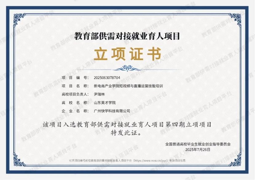 此次立项标志着山东英才学院在深化产教融合、精准对接新电商等新兴产业人才需求方面迈出了实质性步伐。两个项目分别携手北京中云国创数据科技有限公司、广州快学科技有限公司,聚焦新电商领域核心岗位,覆盖直播运营、短视频内容创作与营销、数字化运营、电商供应链管理等关键方向。通过“课程共建—项目共研—岗位共育”全链条协同模式,预计未来3年内将为区域输送600余名“上手快、懂运营、会数据”的高素质新电商人才。