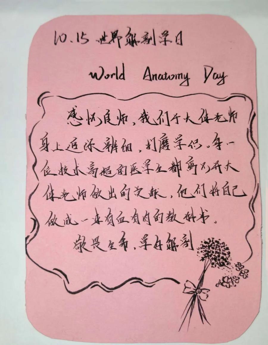 在精彩的宣讲后,志愿服务团队成员向每位同学分发彩色“心语卡”,同学们纷纷拿起笔,在上面写下对大体老师们为医学奉献的敬意与期望。有的同学表达了对解剖学先驱们勇敢探索、无私奉献精神的敬佩;有的同学则写下了自己对医学事业的热爱与追求,希望能够成为像先驱们一样优秀的医学人才;还有的同学则分享了自己在学医道路上的感悟与成长,对未来充满了信心和期待。