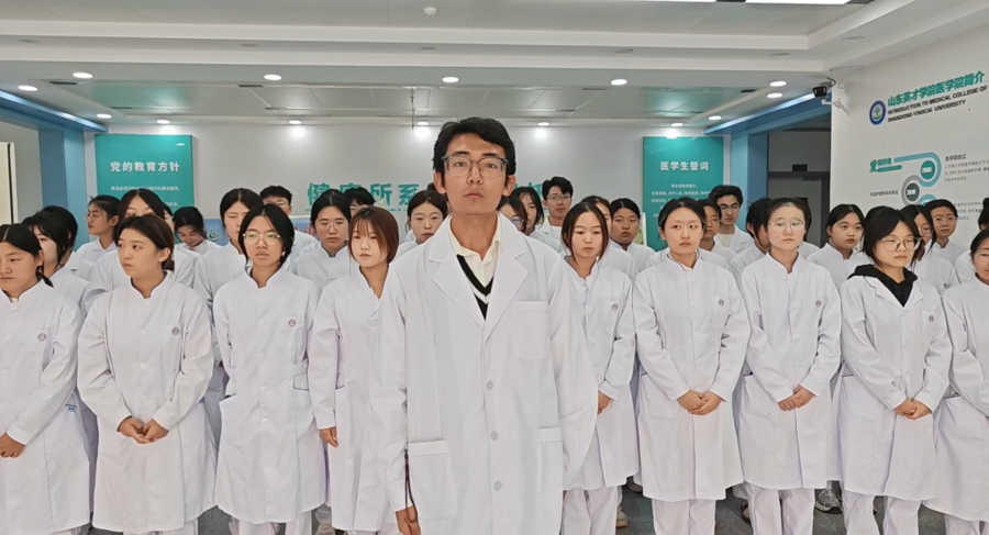 紧接着,山东英才学院“生命与健康”志愿服务团队副队长韩江悦同学带领此次参加活动的成员们庄严宣誓。他们高举右手,声音洪亮,誓言在活动现场回荡。不仅彰显了同学们对解剖学的敬畏和对生命的尊重,更体现了他们为医学事业奉献的决心。