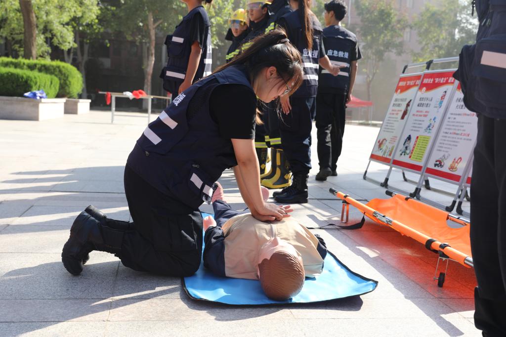 灭火实战演练环节,校应急救援队成员现场示范灭火器“提、拔、握、压”操作步骤,并邀请新生代表上台实操,手把手指导纠正动作,让新生亲身体验灭火过程。此外,救援队还利用模拟人体模型,详细演示心肺复苏紧急救护技能,从胸外按压深度、频率到人工呼吸操作要领,逐一讲解并现场答疑,进一步增强了演练的实用性与教育效果,帮助师生掌握“黄金急救时间”的处置方法。
