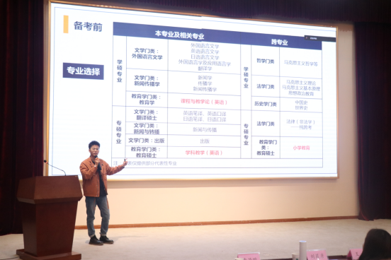 我院2015级优秀毕业生、现山东师范大学硕士研究生曹若鹏就个人成长经历、备考经验、备考建议等方面与考研学弟学妹们展开交流分享。他向同学们介绍自己考研的“曲折经历”,从“一战”失败心态崩溃到重整旗鼓专注“二战”,学长用自己的考研“血泪史”为学弟学妹们提供了宝贵的经验分享及考研建议。在答疑环节中,同学们踊跃提问,学长利用自己的经验为同学们答疑解惑,明晰考研规划。