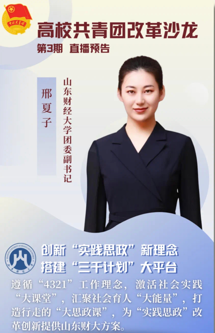 此次直播特别邀请了中国石油大学(华东)团委书记季林海和山东财经大学团委副书记邢夏子作为本次直播的宣讲人员,向大家分享经验。季林海老师以《构建“三型三点”工作模式,深化团支部建设》为题,向大家强调了聚焦团支部基本单元功能定位、政治理论教育首要任务、实践育人主体作用,建章立制、改革创新,着力将工作延伸到基层。邢夏子老师在直播中提出创新"实践思政新理念,搭建‘三千计划’大平台。指出要遵循‘4321’工作理念,激活社会实践‘大课堂’,汇聚社会育人‘大能量’,打造行走的‘大思政课’,为‘实践思政’改革创新提供山东财大方案。