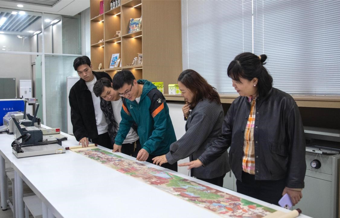 在参观过程中,教学院长郝莹详细讲解了设计学院的办学理念、课程设置、师资力量以及实践教学等方面的情况。温州博景文化有限公司陈云超董事长一行参观了设计综合实验教学实训中心、专业成果展示空间等场所,对学院的教学设施和环境表示高度赞赏。双方还就如何加强实践教学、提升学生创新能力等方面进行了深入探讨。陈董事长表示,愿意为设计学院的学生提供实践机会和实习岗位,帮助他们更好地将理论知识与实践相结合,提升专业技能和就业竞争力。
