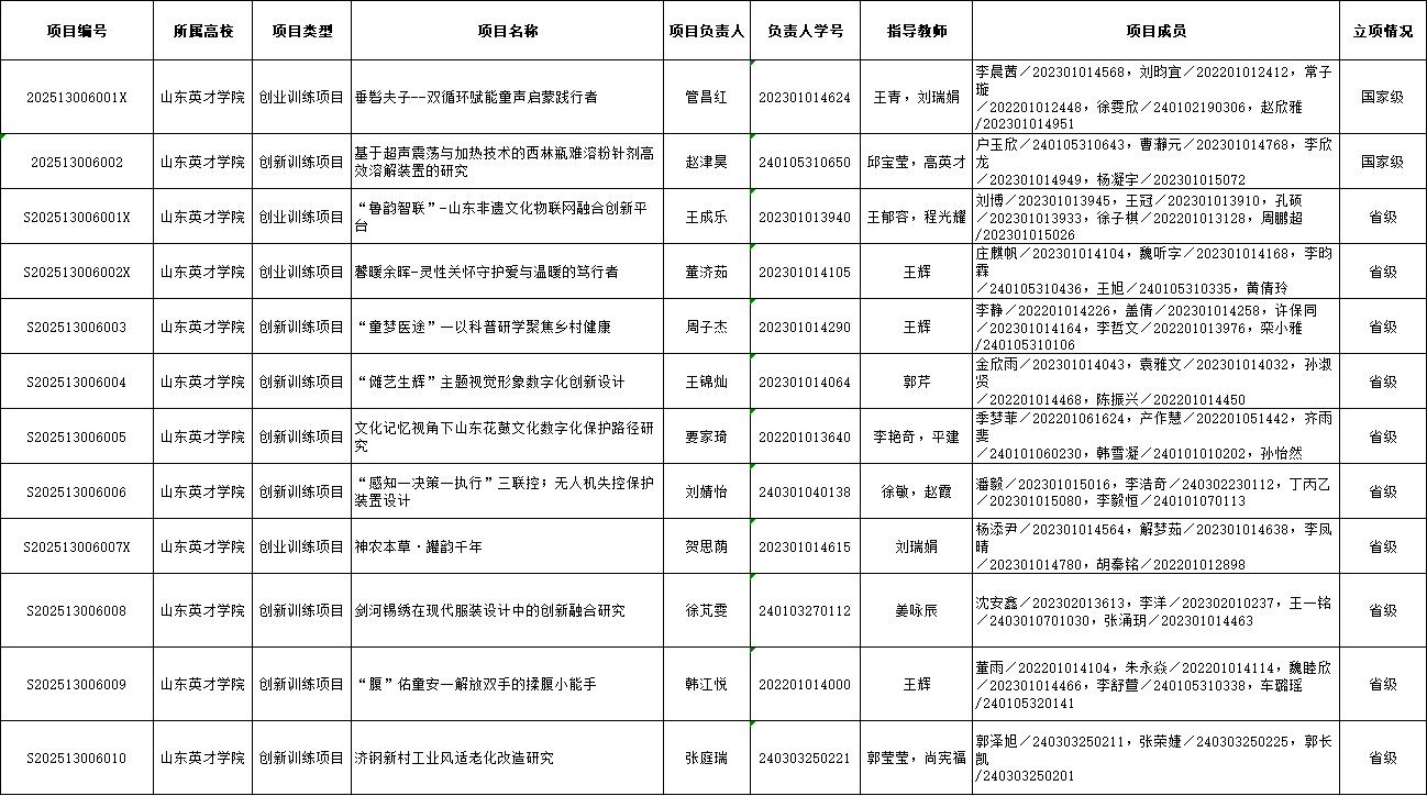 近日,山东省教育厅公布了2025年山东省大学生创新训练计划项目省级以上立项名单,山东英才学院获国家级立项2项,省级立项10项,其中,创新训练项目8项,创业训练项目4项。