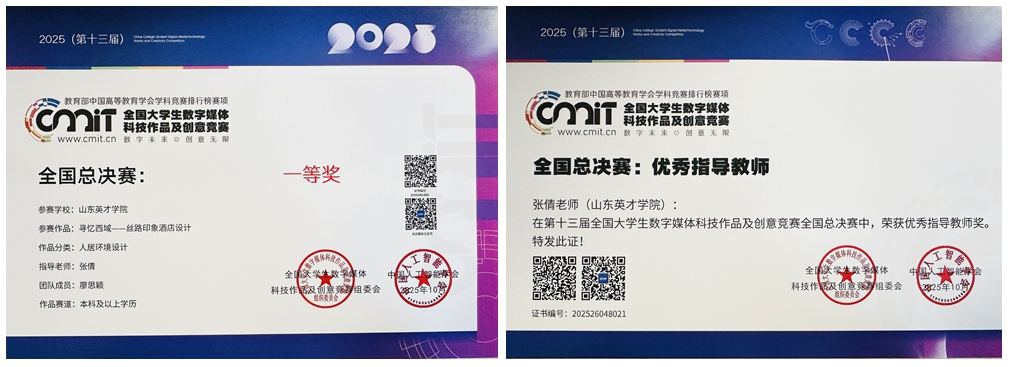 在本次竞赛中,山东英才学院设计学院提交了丰富多样的数字媒体与科技作品,经过激烈角逐,共评选出国家级一等奖1项、国家级三等奖7项,省级一等奖1项、省级二等奖7项、省级三等奖6项,涵盖环境设计、视觉传达、产品设计等多个专业方向。参赛作品主题多元,涉及文化传承、城市更新、IP设计、空间营造等领域,充分体现了我校在“艺术+科技”融合育人方面的扎实成效。