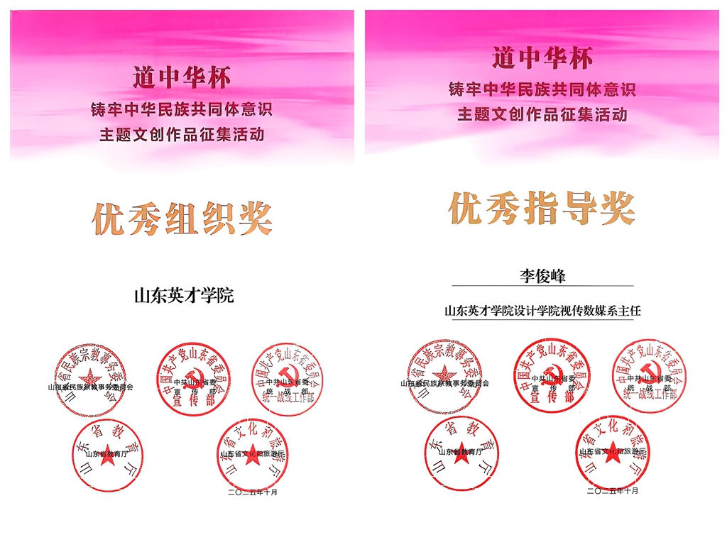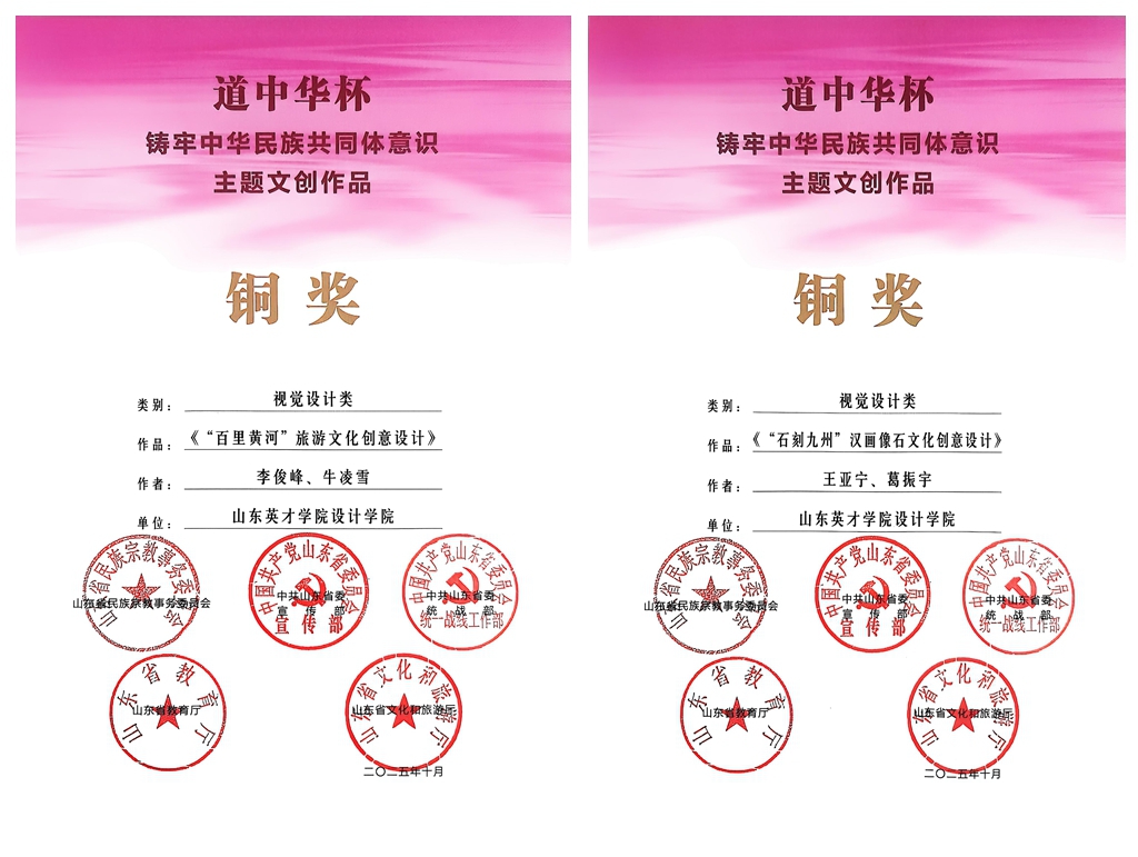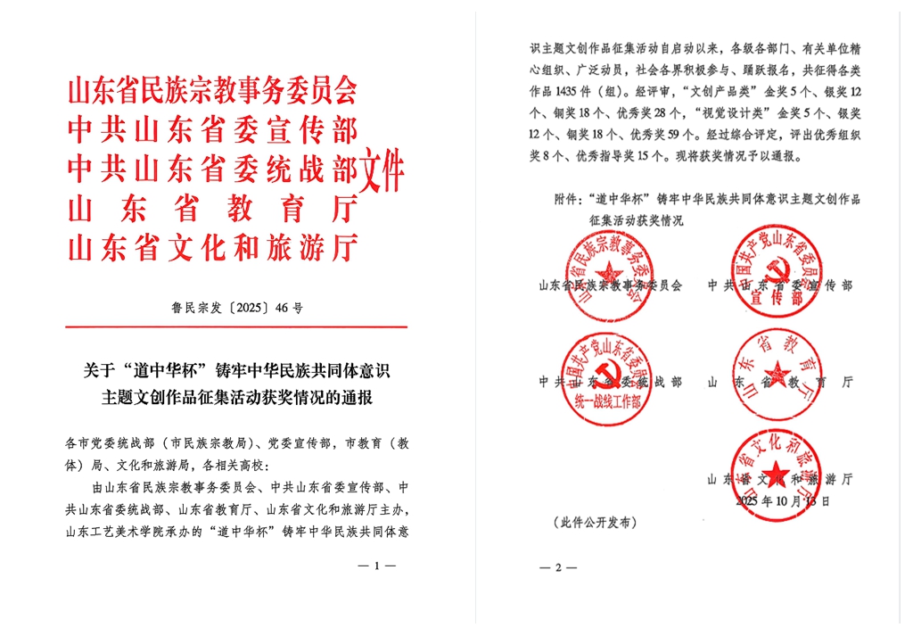 本次征集活动由中共山东省委宣传部、统战部及省教育厅等多部门联合主办。获奖作品中,李俊峰、牛凌雪团队的《“百里黄河”旅游文化创意设计》,以黄河流域历史文化为主线,描绘了各民族共同繁荣的生动图景;王亚宁、葛振宇团队的《“石刻九州”汉画像石文化创意设计》,则巧妙融合传统石刻艺术与现代设计语言,传递了深厚的民族文化基因。两件作品均获文创产品类铜奖。设计学院李俊峰教授获评“优秀指导奖”。