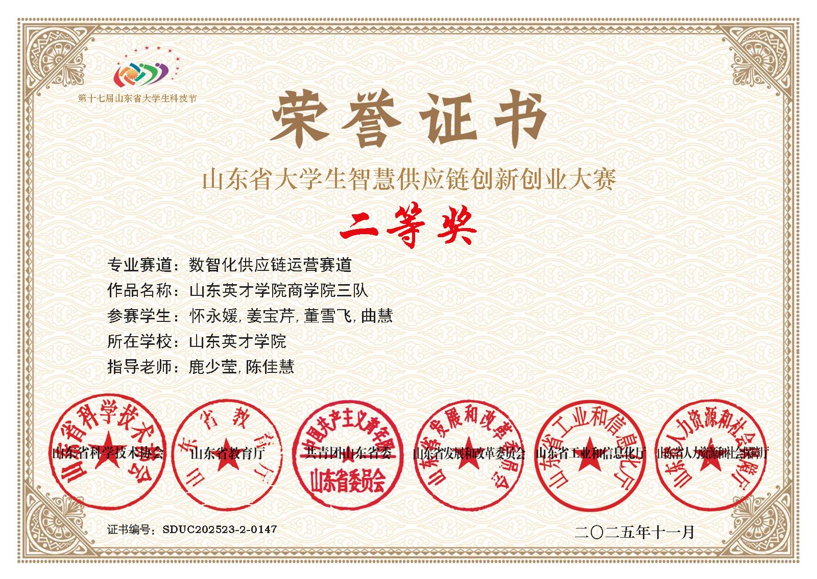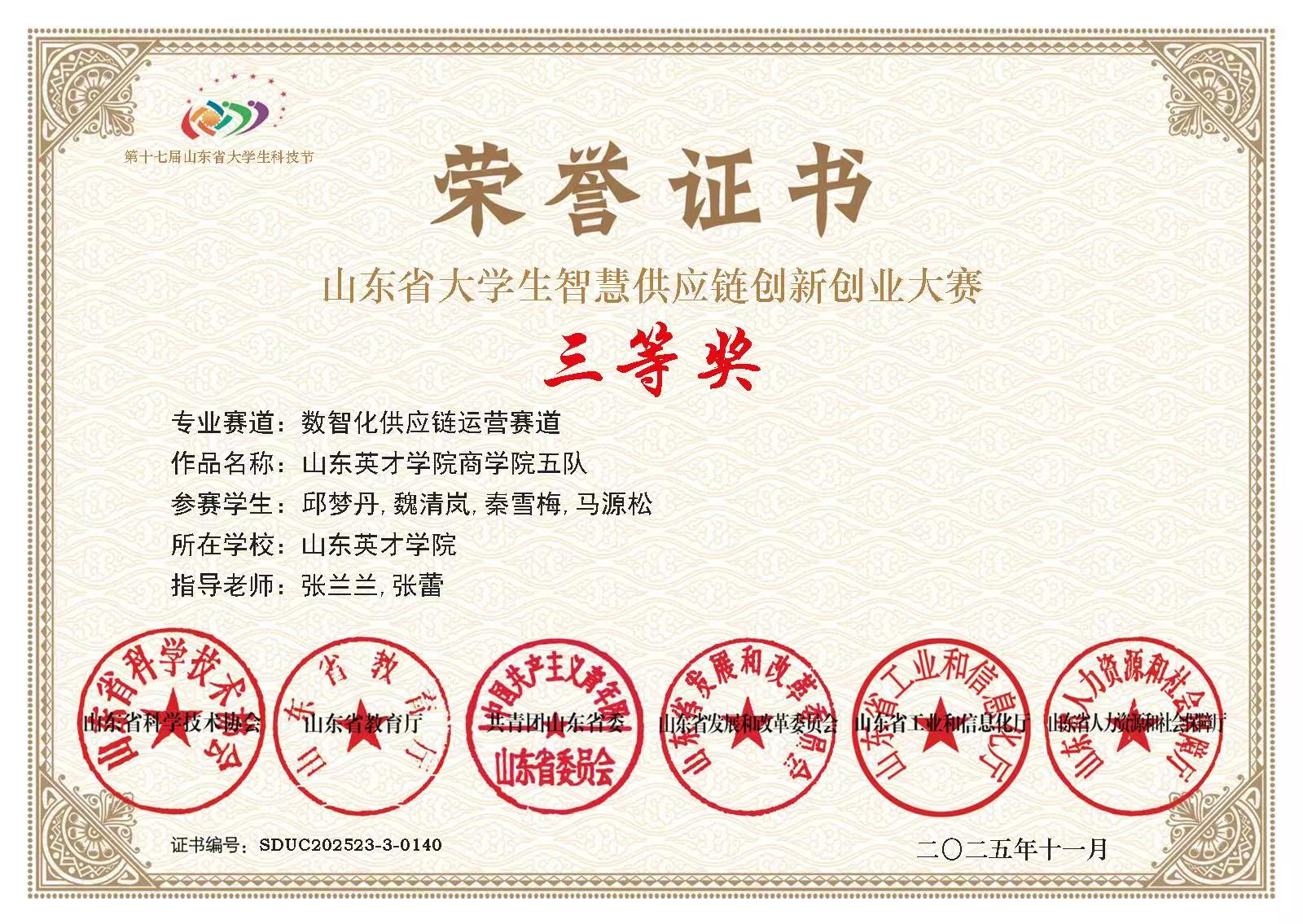 近日,第十七届山东省大学生科技节——山东省大学生智慧供应链创新创业大赛数智化供应链运营赛道线上赛落下帷幕。商学院(国际学院)物流管理系学生凭借扎实专业功底、创新运营思路及出色团队协作能力脱颖而出,最终获得省级二等奖1项、省级三等奖2项,充分展现了我校学生在智慧供应链领域的实践与创新实力。
