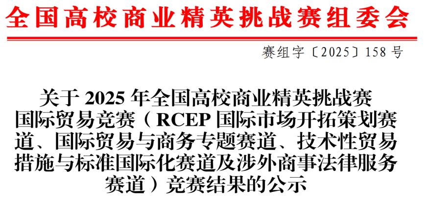 本次竞赛设有RCEP国际市场开拓策划、国际贸易与商务专题、技术性贸易措施与标准国际化、涉外商事法律服务四大赛道,吸引了全国众多高校的优秀学生同台竞技。该赛事已成为检验高校国际贸易类专业教学质量、学生实践能力以及院校赛事组织水平的重要平台。经过激烈角逐,我校参赛团队凭借扎实的专业功底、创新的实践方案和出色的团队协作,在众多参赛队伍中脱颖而出,共斩获一等奖2项、二等奖3项、三等奖1项,充分展现了我校学生过硬的专业素养与良好的综合风采。