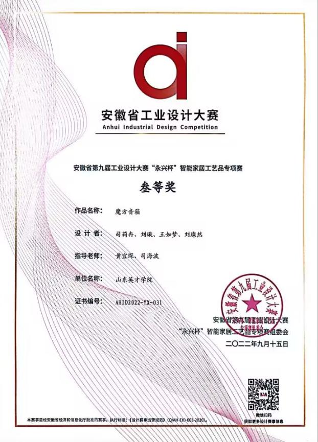 本次大赛全国各个赛区共收到专项参赛作品11000多件,数量均创历史新高,设计的产品创意独特、技术新颖、内涵丰富。设计学院产品设计专业遴选出12件作品参加比赛。其中设计学院教师司海波、王正凯指导的作品《组合休闲椅设计》(作者:苏凤梅、毛爽、王捆捆、胡绍文、陈帅)获得“高雅家居杯”工业设计三等奖;另有教师黄宜琛、司海波指导的作品《魔方音箱》(作者:司莉冉、刘璇、王如梦、李刘璨然)获得“永兴杯”智能家居工艺品专项三等奖。
