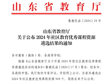 近日,山东省教育厅公布了2024年度社区教育优秀课程资源及2024年度山东省继续教育数字化共享课程的遴选结果。王宏教学团队的《“创造力”成就优秀宝宝》、王素玲教学团队的《邻里创客——居民创业技能提升》、李敏玉教学团队的《居住空间环境设计之家具住宅》3门课程被认定为2024年山东省社区教育优秀课程资源。盖美娟教学团队的《基础英语写作》课程被认定为2024年山东省继续教育数字化共享课程。