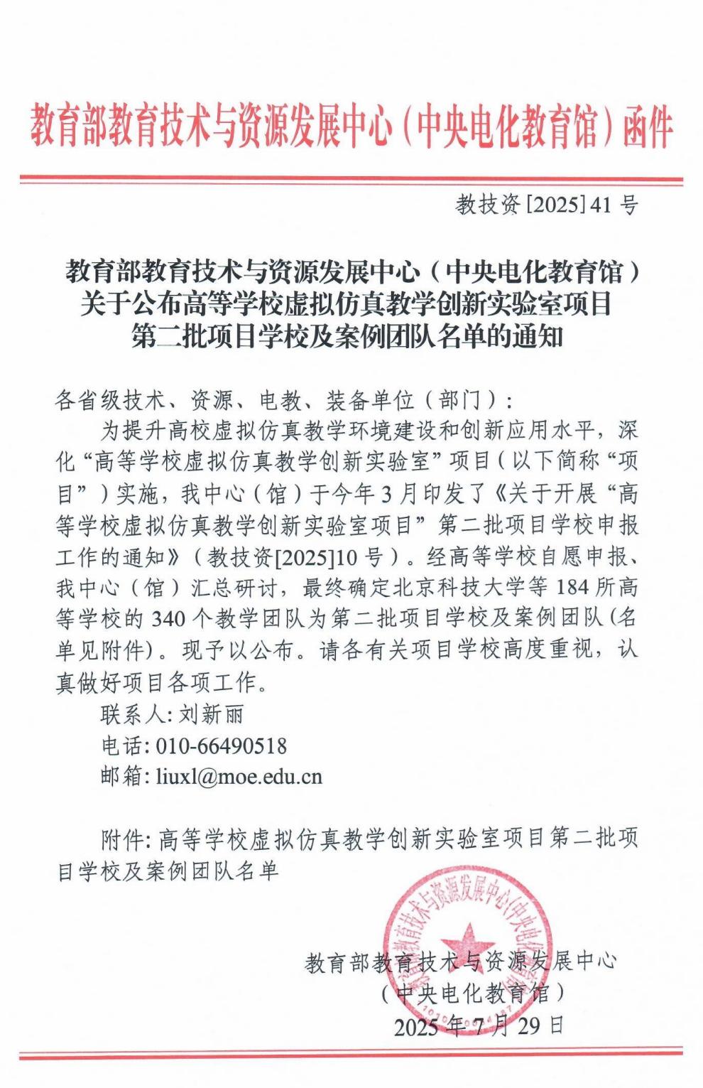 近日,教育部教育技术与资源发展中心(中央电化教育馆)公布《高等学校虚拟仿真教学创新实验室项目第二批项目学校及案例团队名单》(教技资〔2025〕41号)。我校“虚拟仿真教学创新实验室项目”成功获批,这是我校首次获批该类项目立项。