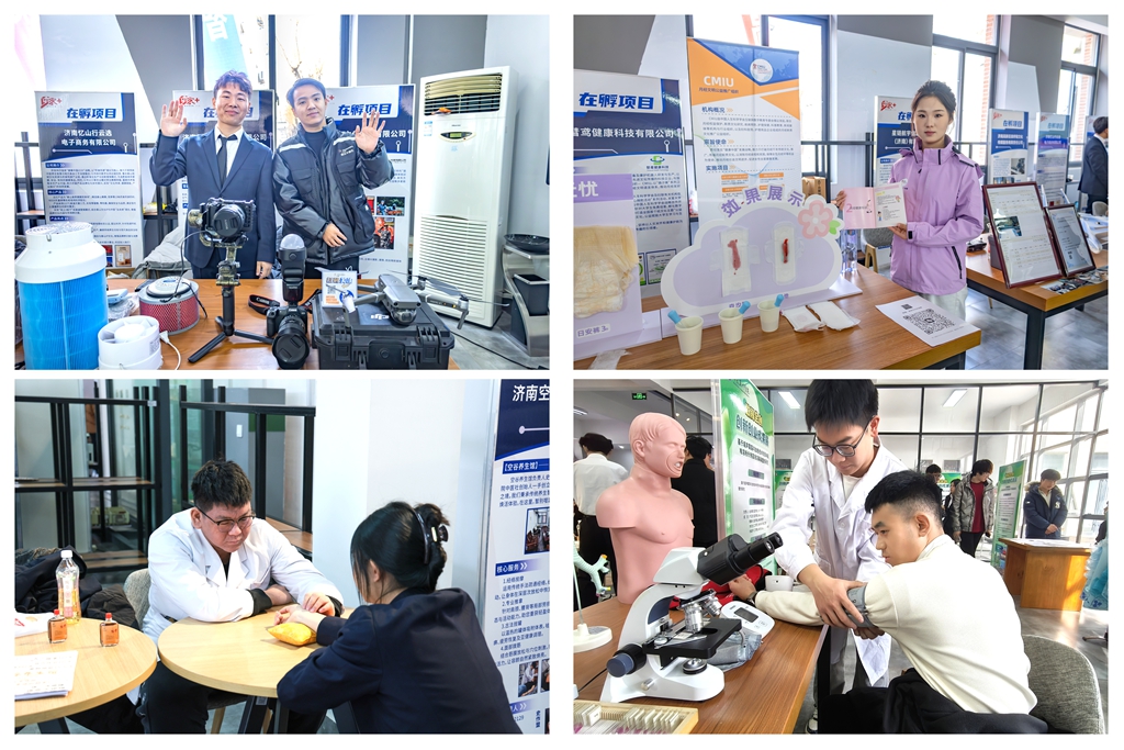 本次创新创业成果展以“专业赋能创新,实践驱动创业”为核心,各参展项目亮点频出。工学院聚焦智能装备突破,商学院探索乡村振兴与产业赋能,学前教育学院构建沉浸式学习场景,医学院重点推动医工结合与互动体验,设计学院致力非遗创新融合,音乐舞蹈学院拓展艺术疗愈实践。“创客+”创业孵化基地集中展示了毕业生创业项目,覆盖文化传播、技术服务、民生健康等领域,其中慧鸢科技、光年映画等校友企业表现突出,展现出“敢闯会创”的扎实功底与辐射带动效应。