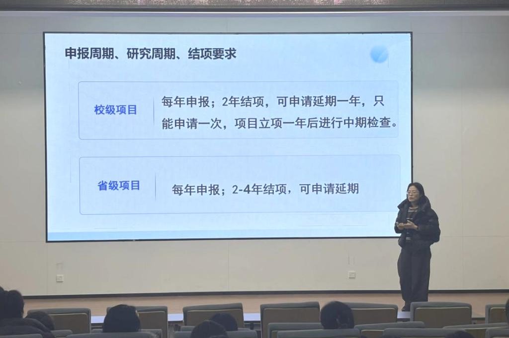 会上,韩老师首先围绕申报周期、研究周期及结项要求三大核心要素展开解读,详细梳理了申报的时间节点、研究周期的合理规划方法,以及结项时需满足的成果要求、材料规范等关键内容,帮助教师们厘清项目推进的时间脉络与核心标准。此外,针对教师们高度关注的奖励资助办法与推荐限额问题,进行了重点说明。随后,韩老师鼓励教师们立足教学实际,紧扣政策导向与产业需求,挖掘具有创新性、实用性的研究课题。
