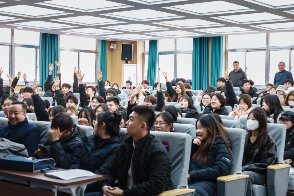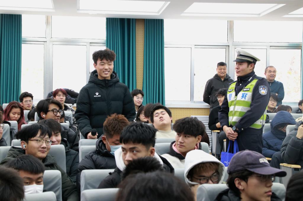 冯庆昊警官则借助近期辖区周边的重大交通事故案例视频,以案说法,直观再现事故现场,深刻剖析事故成因。他向师生详细讲解了预防交通事故的基本方法,提醒大家在驾车时要远离大型货车、杜绝超速、分心及违章驾驶,务必重视交通法规,做到“做文明人、行文明路”。讲座还设置了有奖问答环节,学生们积极就日常出行中的交通困惑提问,冯警官一一给予专业细致的解答,现场气氛严肃而热烈。
