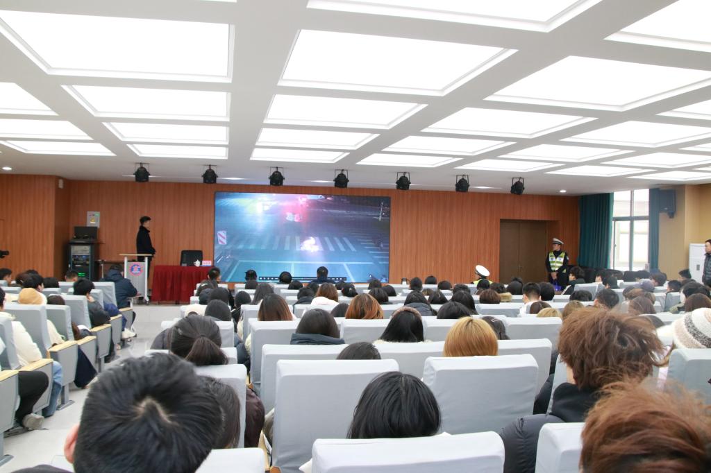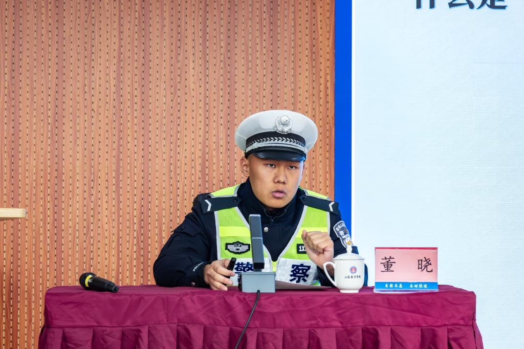 讲座由北校区综合办公室主任高奎主持。起步区交警大队大桥中队董晓、冯庆昊、郝东升三位警官担任主讲。