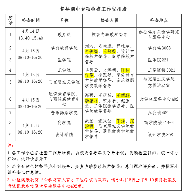 集中检查时间:4月14-15日,具体参见通知附表;实践教学重点听评课时间:第7-8教学周。
