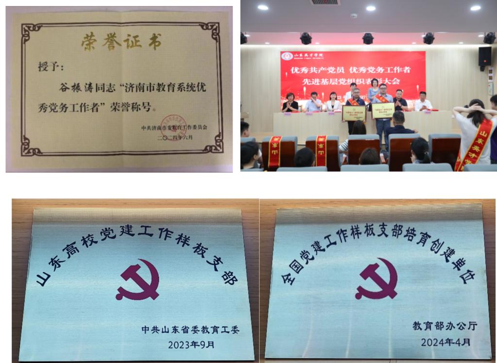 担任教师支部书记以来,他坚持强化政治引领,以习近平新时代中国特色社会主义思想为指导,支部建设始终坚持党建与业务融合双优,充分发挥党支部的核心作用、战斗堡垒作用,成为了商学院教学科研、社会服务等各方面工作的“领头雁”,得到上级组织的认可。2023年谷振涛老师带领支部班子通力合作,出色地通过“山东省首批党建工作样板支部”验收工作,2024年支部成功入选“全国第四批党建工作样板支部”培育创建单位。同时连续3年获批济南市委教育工委“五星级党支部”,获评校级“双带头人”书记工作室,入选山东省高校“双带头人”教师党支部书记“强国行”专项行动团队名单。2024年7月,他获得“济南市教育系统优秀党务工作者”,2024年11月,作为全国3家样板支部创建单位代表之一发言,也是11家代表中唯一的民办高校,在全国高校党建“一融双高”论坛发言交流。