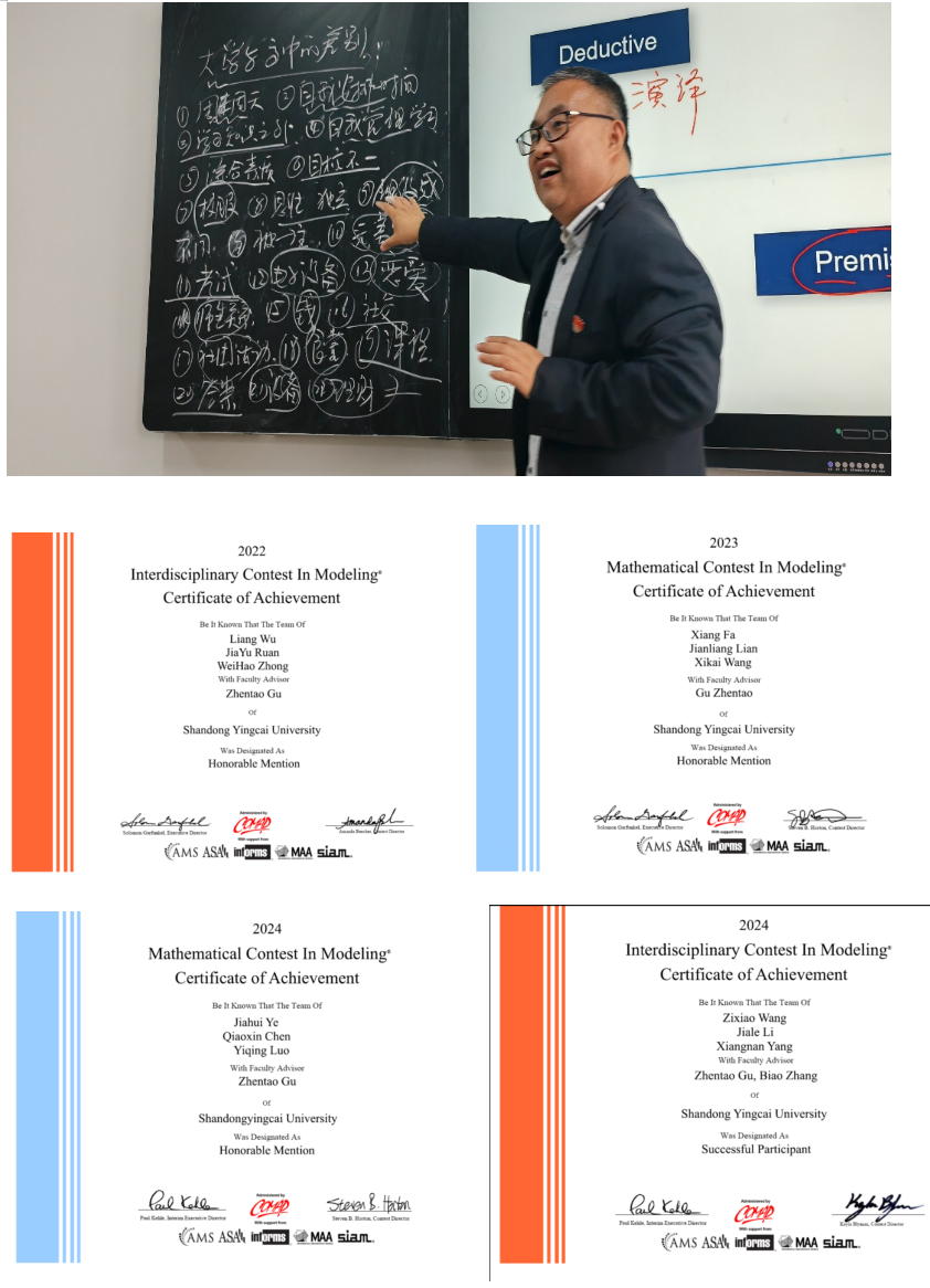 自2006以年来,谷振涛老师是全校第一个组织学生参加全国大学生数学建模竞赛,近二十年来数学建模竞赛已经成为了学校学生竞赛的品牌,先后斩获“高教社”杯、国家一、二等奖多项。2022年,在其带领下学生开始尝试参加美国大学生数学建模竞赛。在谷振涛老师的带领下,英才学子与来自哈佛大学、普林斯顿大学、麻省理工学院、剑桥大学、清华大学、北京大学等国际知名高校学子同场竞技,最终凭借优秀的创新能力、实践能力、科研能力斩获多项国际大奖。