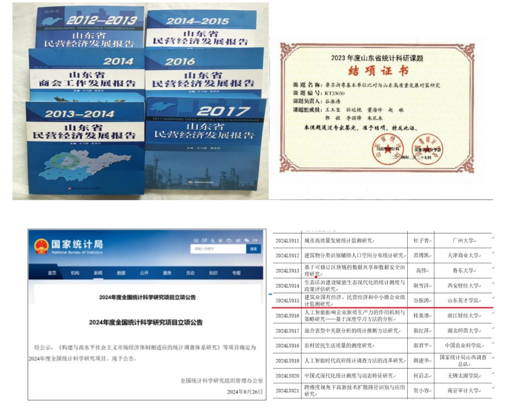 谷振涛老师兼任学校民营经济研究中心主任、山东当代民营经济研究院副院长、山东经营管理研究会秘书长,先后主持国家统计局课题1项、山东省社科规划、山东省软科学、山东省经信委等省级课题3项、中华职教社课题1项、省统计局、省教育厅高校科技计划、济南市哲社、市软科学等市厅级课题6项;承接全国工商联、省市工商联、中国女企业家协会等委托课题5项,各类企业委托横向课题10余项。作为主要编纂人员参与编著蓝皮书《山东民营经济发展报告》5部、《山东省商会发展报告》1部,主持撰写各类政府咨询报告、对策建议、省市人大政协提案等50余篇。近年主持山东省统计科研课题《鲁苏浙粤基本单位比对与山东高质量发展对策研究》(2023年)。该课题致力于推动山东地区的经济发展,以促进鲁苏浙粤地区的基本单位进行比对研究,并提出适用于山东地区高质量发展的对策建议。同时,他还主持全国统计科学研究项目《建筑业国有经济、民营经济和中小微企业统计监测研究》(2024年)。该研究旨在完善建筑业统计监测体系,研究并探索国有经济、民营经济和中小微企业在建筑业中的发展状况,为决策者提供更具参考价值的统计数据和建议。
