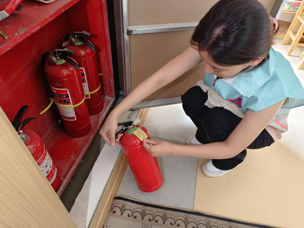 在完成与孩子们的温馨互动后,他们对园内消防设施展开细致检查。实践成员逐一查看灭火器的压力指针是否处于正常范围、保险销是否完好无损。