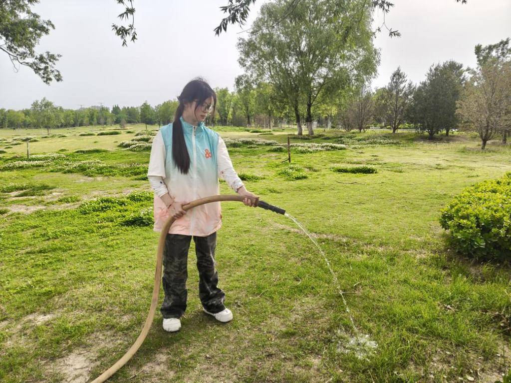 清晨,实践成员手持浇水工具,穿梭在景区的绿植间。他们小心翼翼地为每一株植物浇水,动作娴熟而认真。在他们的悉心照料下,原本有些干涸的植物重新焕发出勃勃生机。