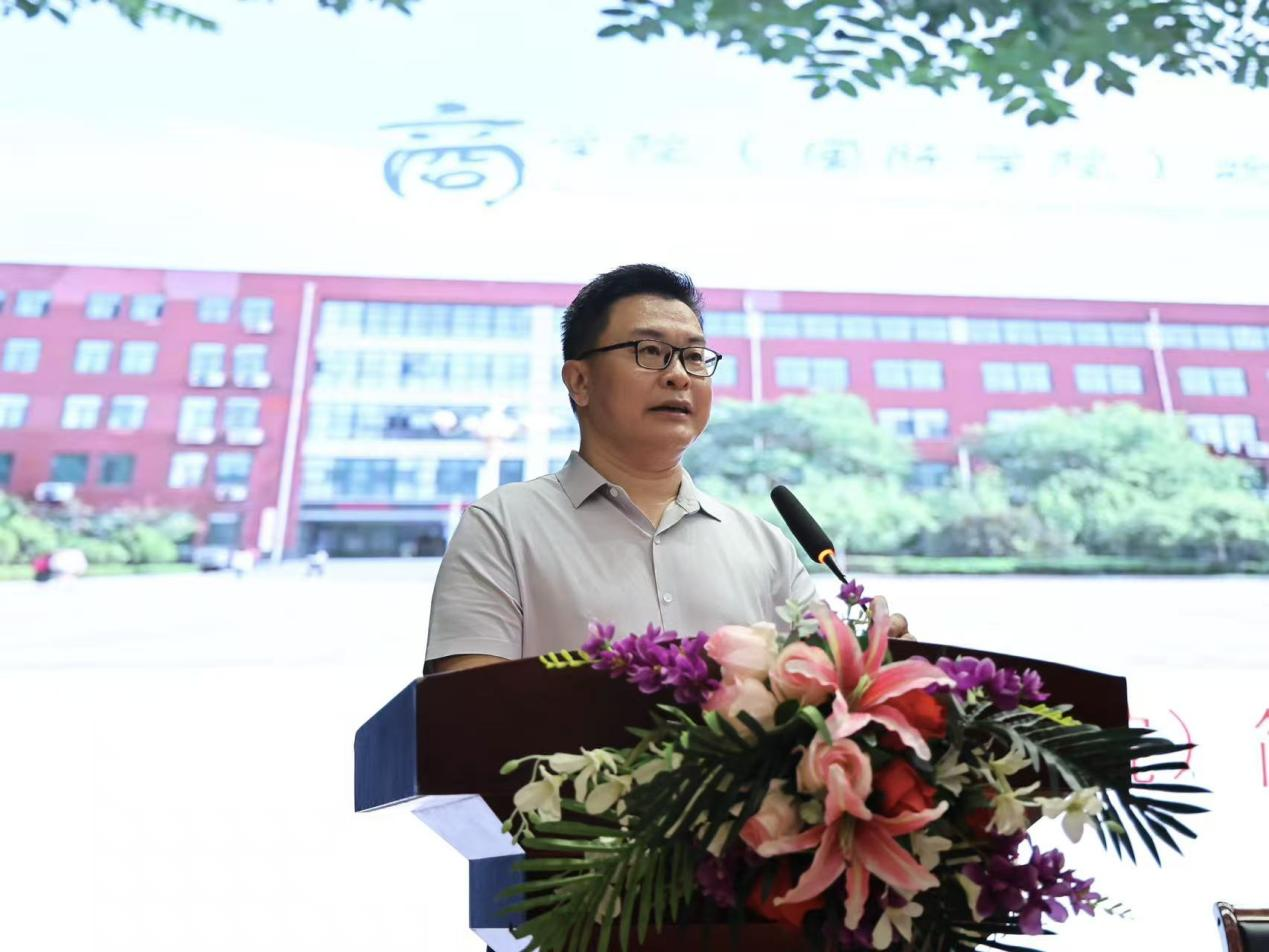 商学院(国际学院)党总支书记、院长赵坤首先代表全院教职工对2025级新生表示热烈欢迎,并详细介绍了学院的办学特色与发展成就。他从"大学第一课"军训出发,提出四点期望:同学们要做到高度重视军训课程,严格自律树立目标,积极适应新环境,正确处理人际关系。最后,他勉励新生将个人理想融入区域发展和社会进步,不负时代使命,并表示全院教师将与新生并肩前行、共同成长。