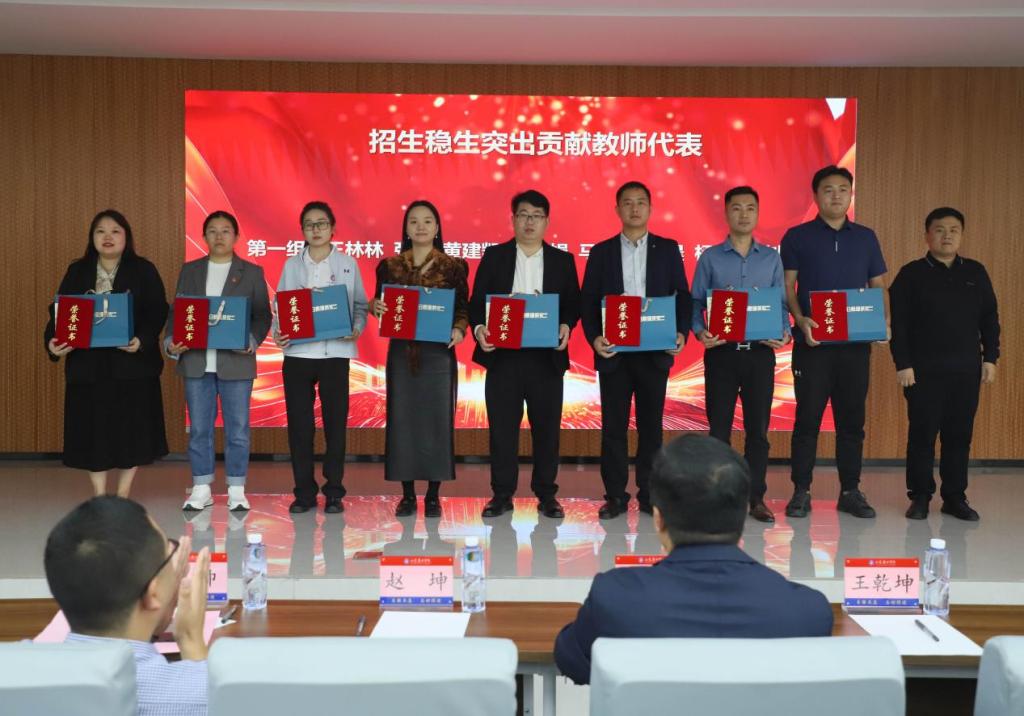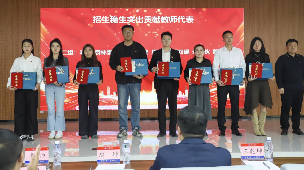 第三项,表彰招生稳生突出贡献教师代表。招生工作是学院发展的生命线。王林林、张静、黄建凯、姜丽娟、马宝林、陈晨、杨兴辉、刘业恒、李阳、袁林雪、薛萌、孟繁昊、周骏骐、邱双砚、赵汝秋、魏雪梅等16位老师积极投身招生宣传与生源稳定工作,表现突出。王乾坤处长为获奖教师颁奖。