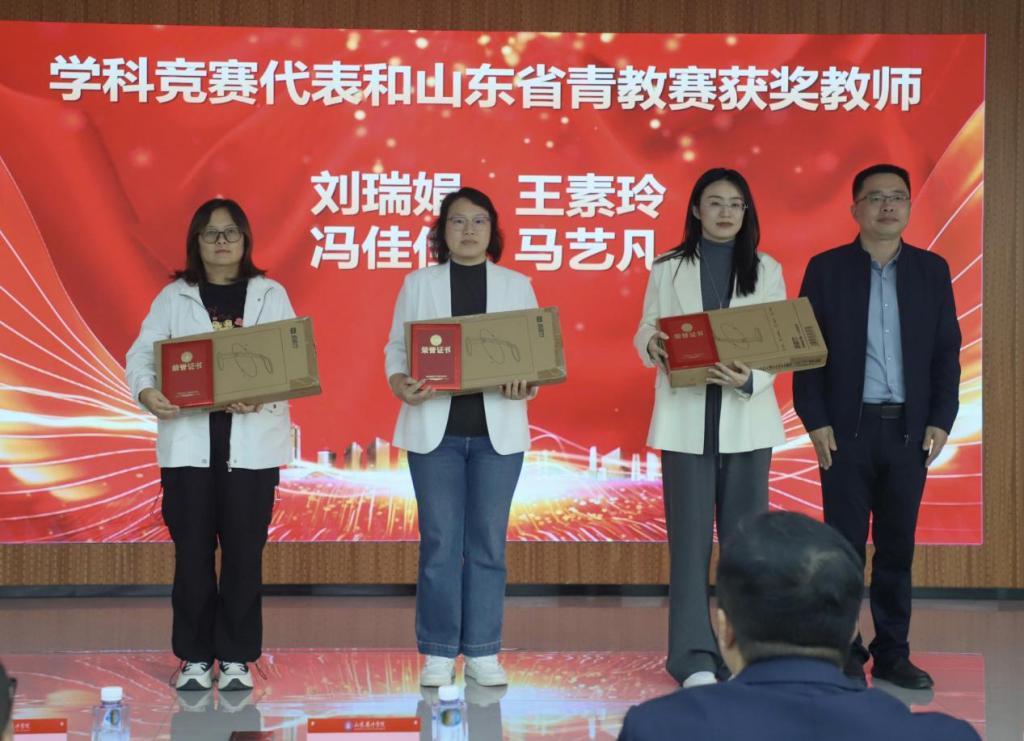 第二项,表彰学科竞赛和山东省青教赛获奖教师。在学科竞赛指导与高水平教学竞赛方面,刘瑞娟、王素玲、冯佳佳、马艺凡四位老师成绩显著,分别在各类学科竞赛及山东省青年教师教学比赛中斩获佳绩。殷永生副院长为获奖教师颁发荣誉证书。