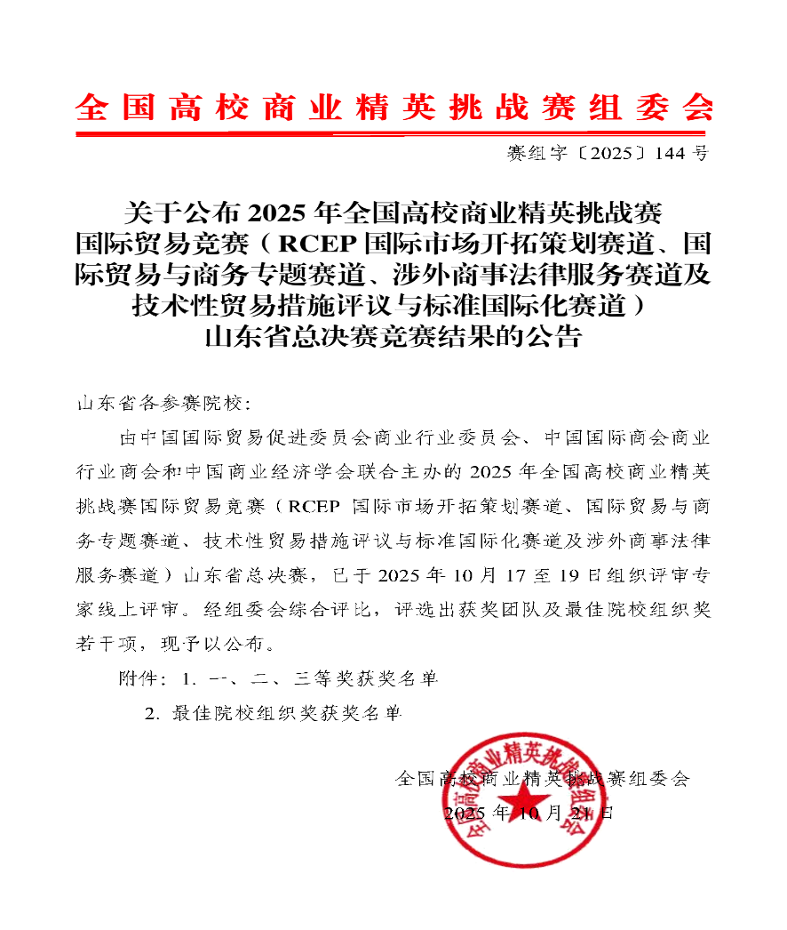 2025年10月21日,由中国国际贸易促进委员会商业行业委员会、中国国际商会商业行业商会及中国商业经济学会共同主办的2025年全国高校商业精英挑战赛国际贸易竞赛山东省总决赛在线上圆满落幕。我校获得最佳院校组织奖,商学院(国际学院)学子在多个赛道中表现优异,共斩获省级一等奖、二等奖、三等奖多项,展现了扎实的专业素养与出色的综合能力。