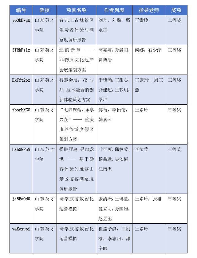 本次大赛中,我校参赛团队聚焦文旅与会展领域的前沿趋势与实际需求,推出了多个兼具创新性与实用性的优质项目。其中,由刘丹、刘璐、戴永征同学组成的团队,在王素玲老师的指导下完成的《台儿庄古城景区消费者体验与满意度调研报告》,以详实的调研数据、深入的问题分析和可行的优化建议,获得本科组国家级二等奖。另有6个项目凭借鲜明的创新亮点荣获国家级三等奖,其中,张淯淞团队和崔盛子淇团队聚焦研学旅游行业的数智化转型,构建高效运营模式,为行业发展提供了新思路。