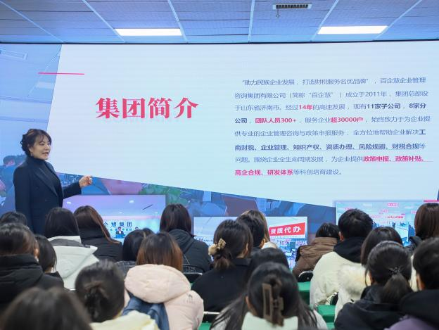 活动伊始,百企慧集团黄芹总经理从企业简介、发展历程切入,系统阐述了集团的主要组织架构、核心业务构成及重点合作企业资源,让学生们对企业管理咨询行业及财务相关实务工作有了全面的初步认知。随后,黄总聚焦学生关切,针对初期实习安排、专业资格考证规划、职业发展路径选择及薪资待遇等热点问题,进行了详尽且实用的解答,为同学们理清了职业发展思路。