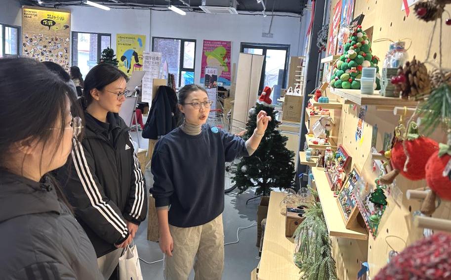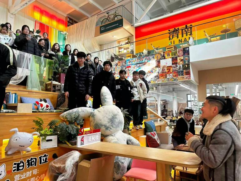 随后,师生一行实地参观了曼昆(济南)文化产业发展有限公司。通过近距离观摩,师生深入了解了公司文创产品在跨境电商领域的完整运营链条。社区中心负责人王嘉义结合公司实际业务,系统讲解了跨境直播运营、数据化分析、内容创意与视觉呈现等环节的实战经验与技能要求,使同学们对专业知识在真实商业场景中的应用有了直观感知。此外,匠杺社石总经理全面介绍了公司文创产品跨境电商的业务模式、市场战略与运营策略,重点剖析了选品逻辑、跨境直播推广及数字营销的核心要点,进一步加深了学生对行业动态与岗位能力的认知。