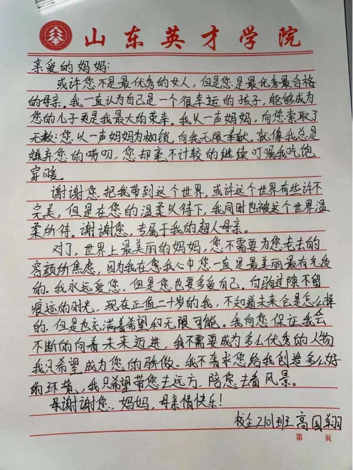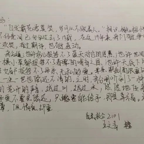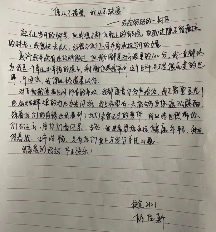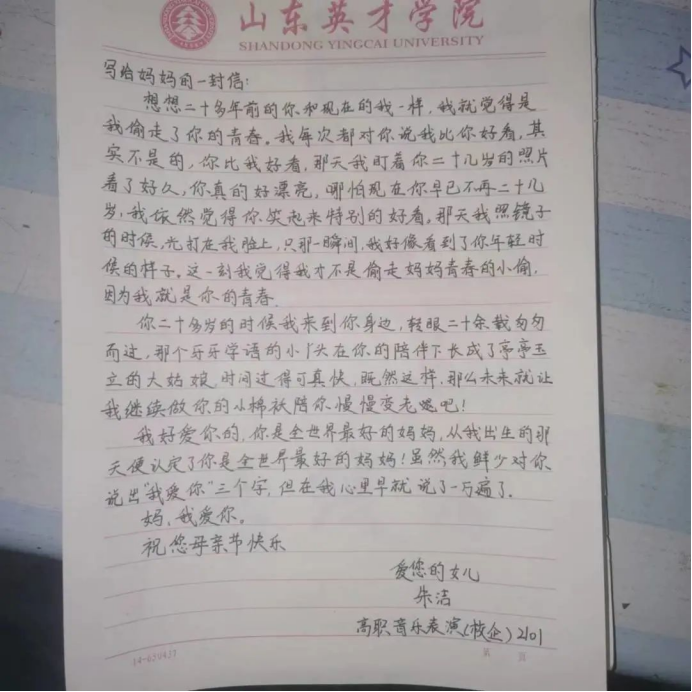 在我成长的这些年中,一直都有与您有关的美好回忆。清晨的叫醒、美味的饭菜、无数遍的唠叨……这些平凡的日常却让我变得不平凡,让我勇敢面对挑战,让我在舞台上无所畏惧、闪闪发光,因为我知道每当我回头时都会有人在我的身后为我撑腰。您心中的这个孩子还在成长,不久后的一天必会成为您的依靠和骄傲!