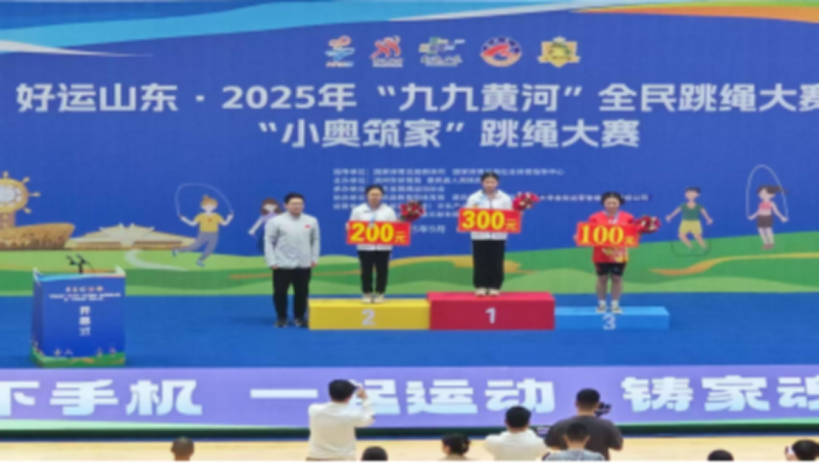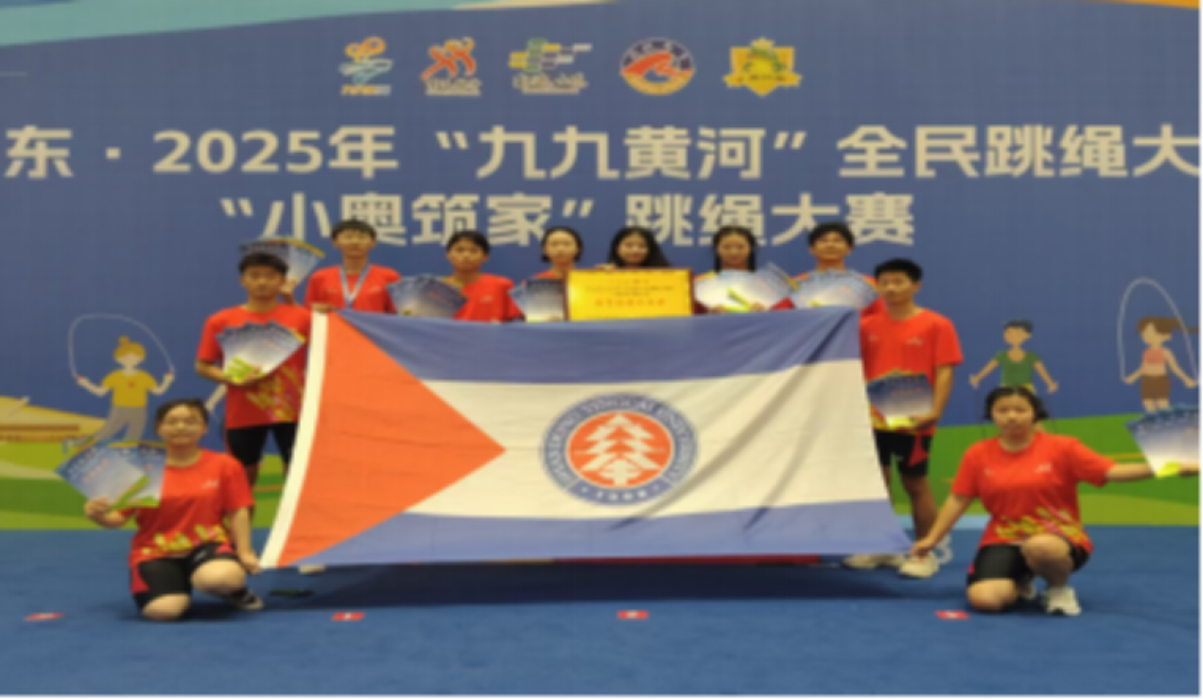 2025年9月20日,“好运山东”2025年“九九黄河”全民跳绳大赛暨“小奥筑家”跳绳大赛在惠民县全民健身中心圆满落幕。本次赛事由滨州市体育局、惠民县人民政府主办,山东省跳绳运动协会承办,惠民县教育和体育局协办,吸引沿黄九省(市)共350名选手参赛,我校花样跳绳队凭借扎实的技术功底与出色的团队协作,在众多选手中脱颖而出,共斩获6项第一名、9项第二名、2项第三名及2项第四名的成绩。