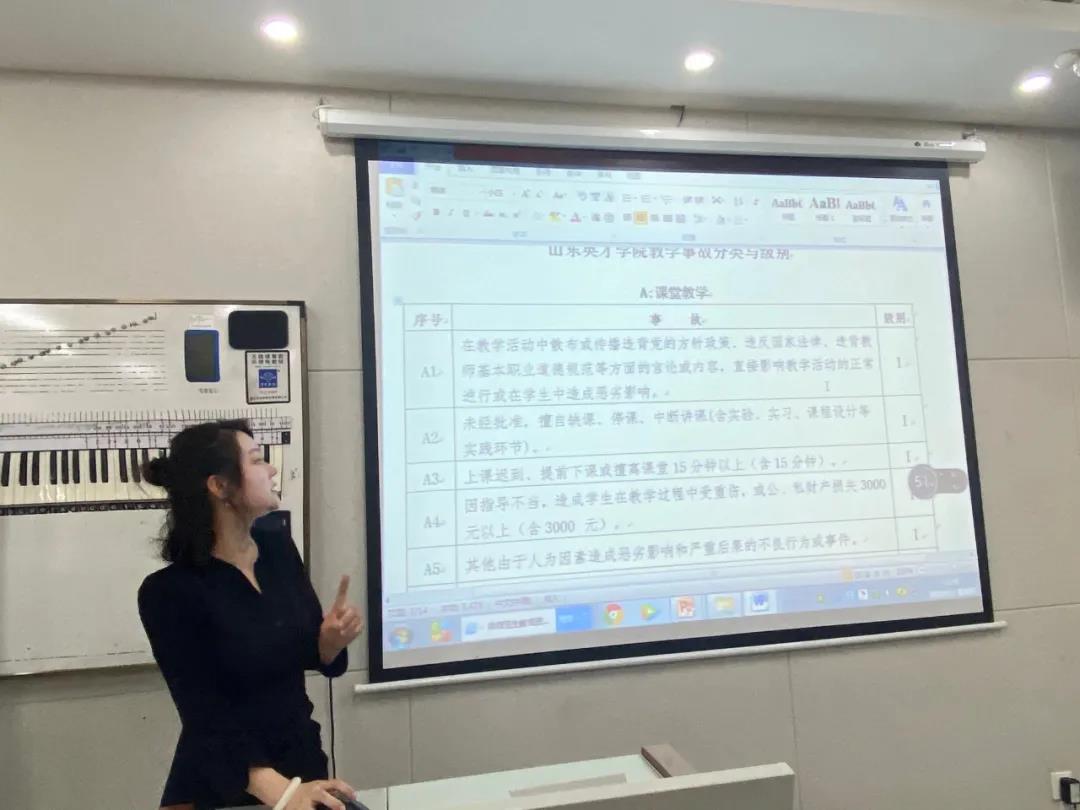 巩院长在“新员工入职培训会上”对教师管理条例作讲解,强调对学生要认真负责。