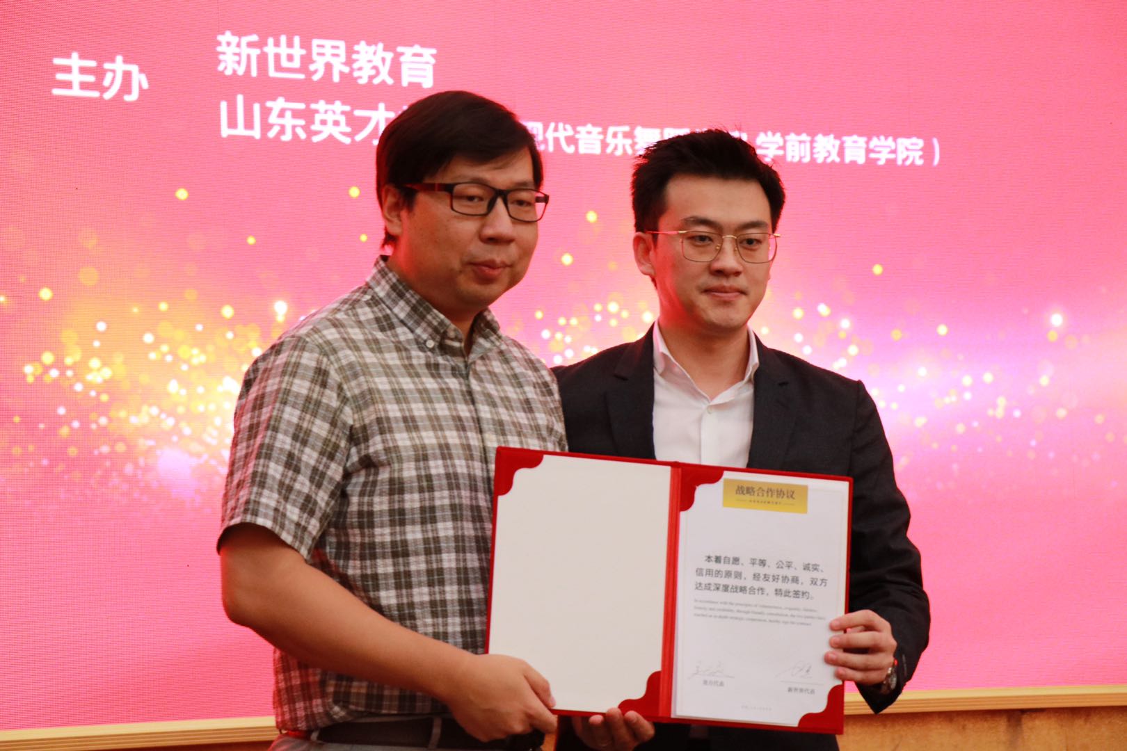 最后,在全场领导和嘉宾的共同见证下,新世界董事长曹恒与现代音乐舞蹈学院吴可畏院长、学前教育学院赵坤院长签署了战略合作协议,同时,华风演讲大赛山东院校组正式启动。
