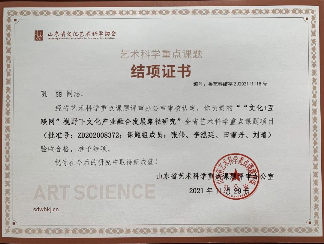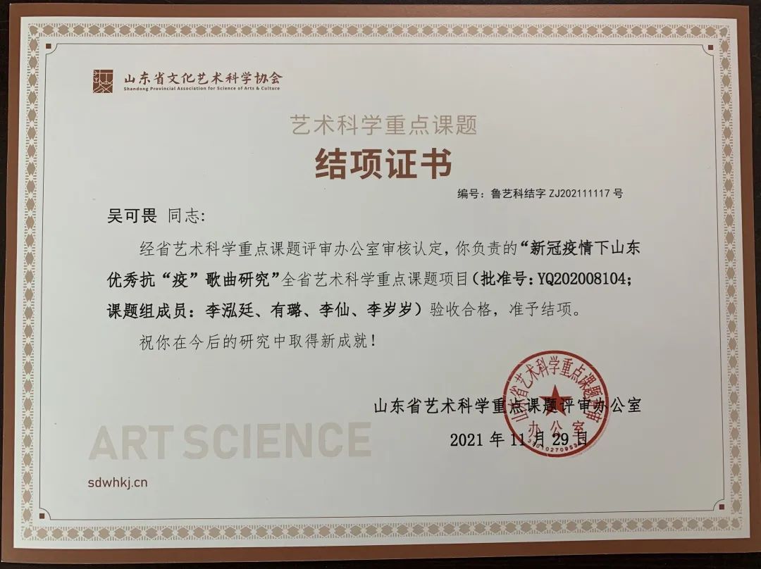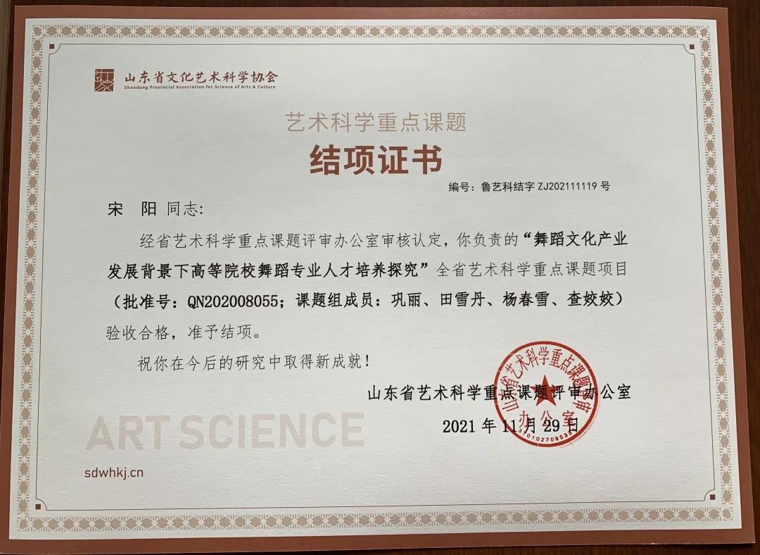 2021年11月29日,现代音乐舞蹈学院三项山东省艺术科学重点课题顺利结项,分别是吴可畏院长的《新冠疫情下山东优秀抗“疫”歌曲研究》、巩丽院长的《“文化+互联网”视野下文化产业融合发展路径研究》以及宋阳老师的《舞蹈文化产业发展背景下高等院校舞蹈专业人才培养探究》。三项课题分别从不同视角对音乐、文化产业与舞蹈进行研究,提出了独到的见解。