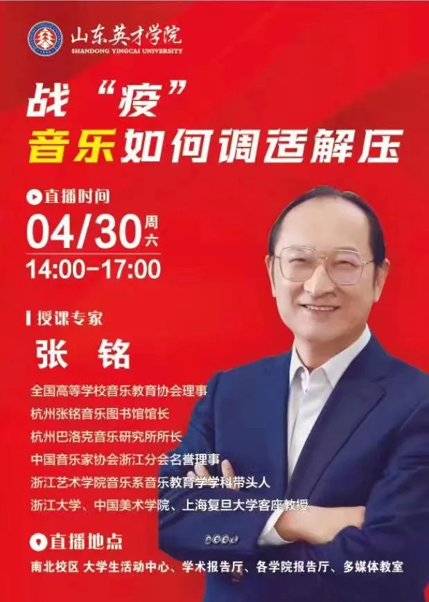 为推动学校以文化人和美育工作,同时缓解疫情封校我校师生带来的不良情绪与巨大压力,4月30日14:00,我校特邀全国高等学校音乐教育学会理事、浙江艺术学院张铭教授为师生做“战疫--音乐如何调适解压”专场讲座。
