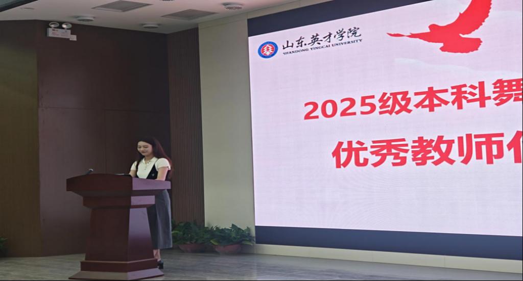 优秀教师代表王敬妍老师以“以舞为媒,不负热爱”为题分享育人感悟。她结合自身讲述了舞蹈艺术背后“日复一日的坚持”与“突破自我的勇气”,鼓励新生既要打磨扎实的专业技能,也要培养对舞蹈艺术的深度思考,“真正的舞者,不仅能在舞台上绽放光芒,更能通过作品传递情感与力量”。王老师的分享既有专业视角,又饱含人文关怀,赢得现场阵阵掌声。