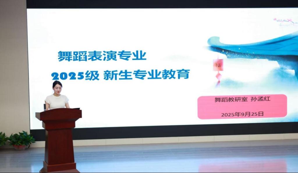 舞蹈教研室主任、舞蹈表演专业负责人孙孟红以“舞蹈艺术的时代价值与专业使命”为开篇,系统梳理了专业发展脉络与学科优势,详解“基础夯实—方向精进—实践创新”的三阶课程体系。并通过往届学生从基础训练到斩获省级舞蹈大赛金奖的成长案例,直观展现专业学习的进阶路径。围绕“舞台表演人才核心素养”的主题展开分享,结合大型舞剧演出等实践、实习项目,解析了舞蹈演员、艺术教育等岗位的能力要求。帮助新生们对未来的学习生涯建立起清晰的认知框架,做好个人成长规划。